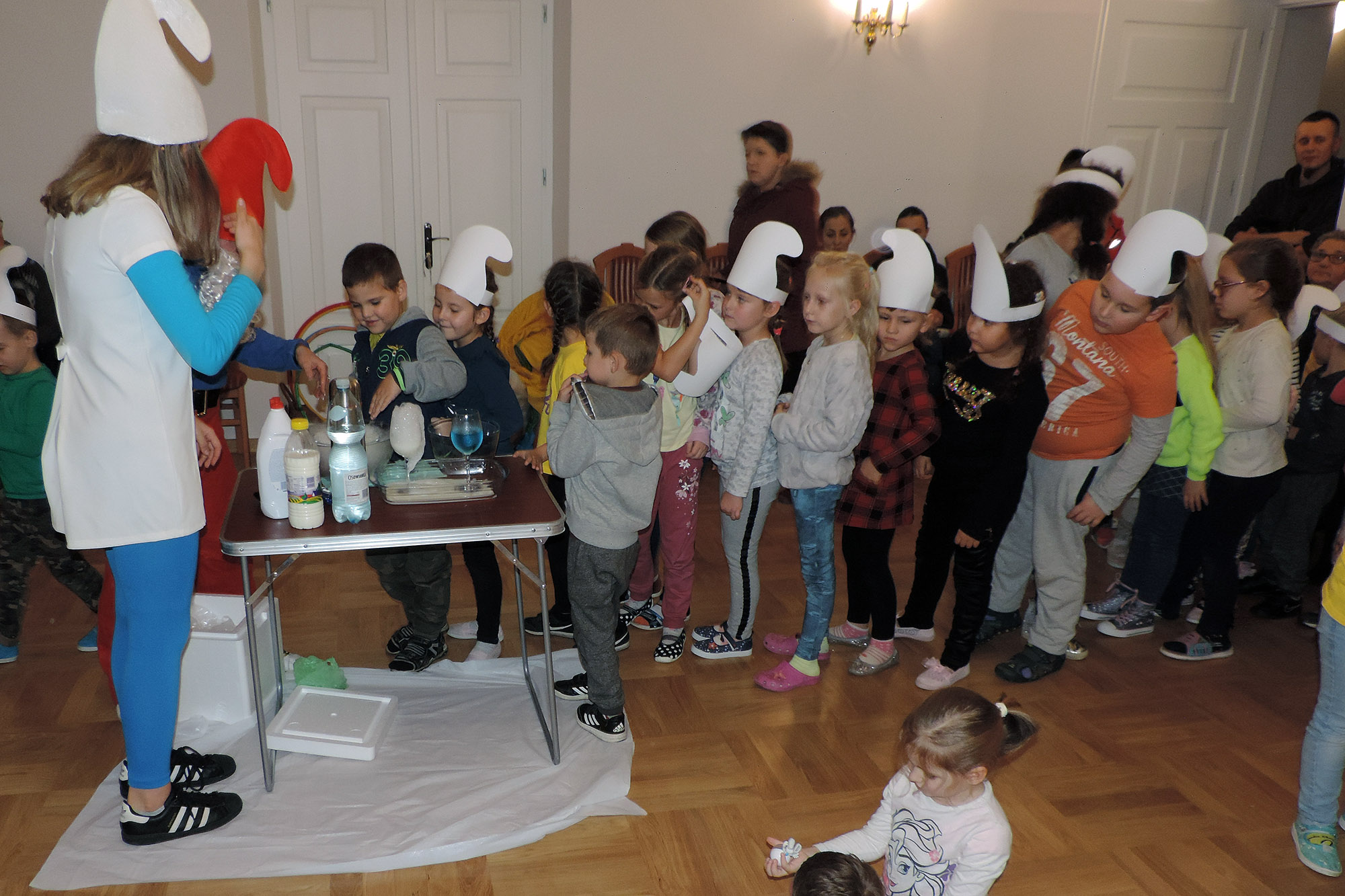 Odwiedzili nas Smerfetka i Papa Smerf, którzy zabrali dzieci na poszukiwanie zaginionych Smerfów oraz wspólne zabawy integracyjne.