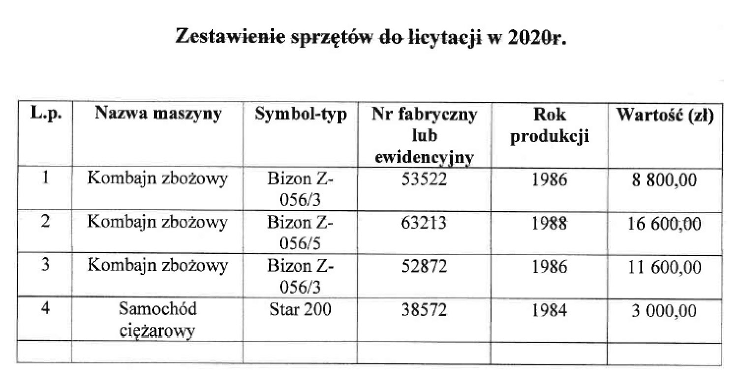 Gminny Zakład Obsługi Sp. z o.o. podaje do publicznej informacji wykaz środków trwałych ruchomych do zbycia w drodze licytacji, która odbędzie się w dniu 22.12.2020 r. o godz. 10:30 w siedzibie firmy z zachowaniem obostrzeń sanitarnych.