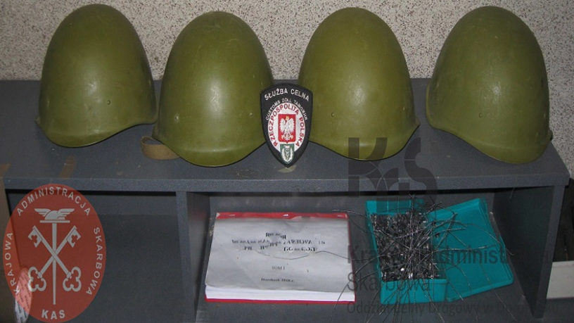 Cztery hełmy wojskowe próbował wwieźć do Polski obywatel Ukrainy. Jak wyjaśnił, hełmy nabył na bazarze w Kowlu i przewoził je dla znajomego mieszkającego w Chełmie, który zajmuje się ich odnawianiem i przystosowywaniem na kaski motocyklowe. Przeciwko 47-latkowi wszczęto postępowanie karne skarbowe, a na poczet kary grzywny zajęto 500 zł. Należy zaznaczyć, że przedmioty o podwójnym zastosowaniu – cywilnym i militarnym – podlegają określonym restrykcjom i wymagane są na ich przewóz odpowiednie zezwolenia.