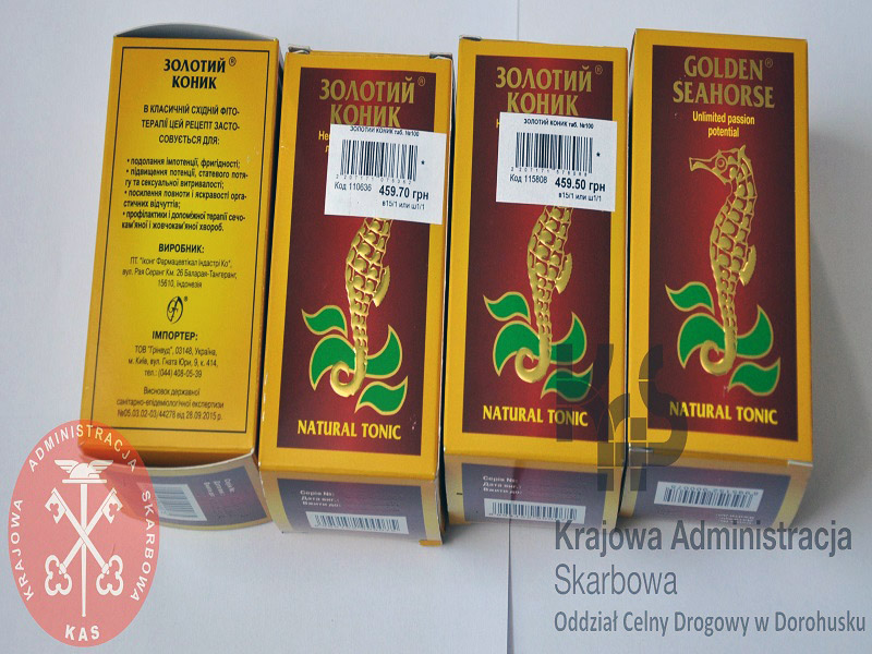 Z kolei 4 marca br. funkcjonariusze udaremnili wwiezienie na obszar naszego kraju 400 sztuk tabletek parafarmaceutyku „Golden Seahorse Natural Tonic”. Do własności nielegalnego towaru przyznał się podróżujący Oplem obywatel Ukrainy. Twierdził on, że są to specyfiki na jego własne potrzeby zalecone przez lekarza… medycyny naturalnej. Wobec 29-latka wszczęto postępowanie karne skarbowe i zajęto 500 zł na poczet grożącej mu kary grzywny.