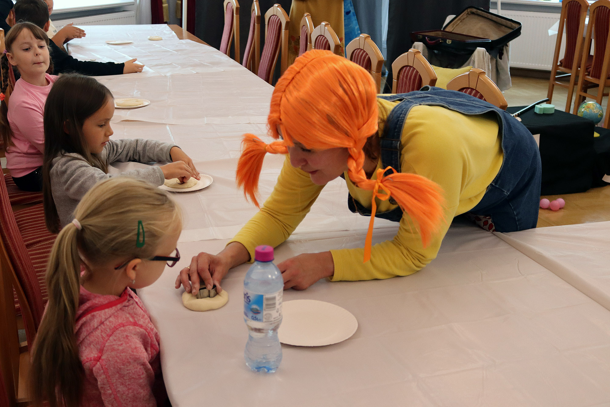 Na zakończenie każdy uczestnik spotkania mógł w towarzystwie rudowłosej bohaterki stanąć na podium oraz wykonać medal z masy solnej.