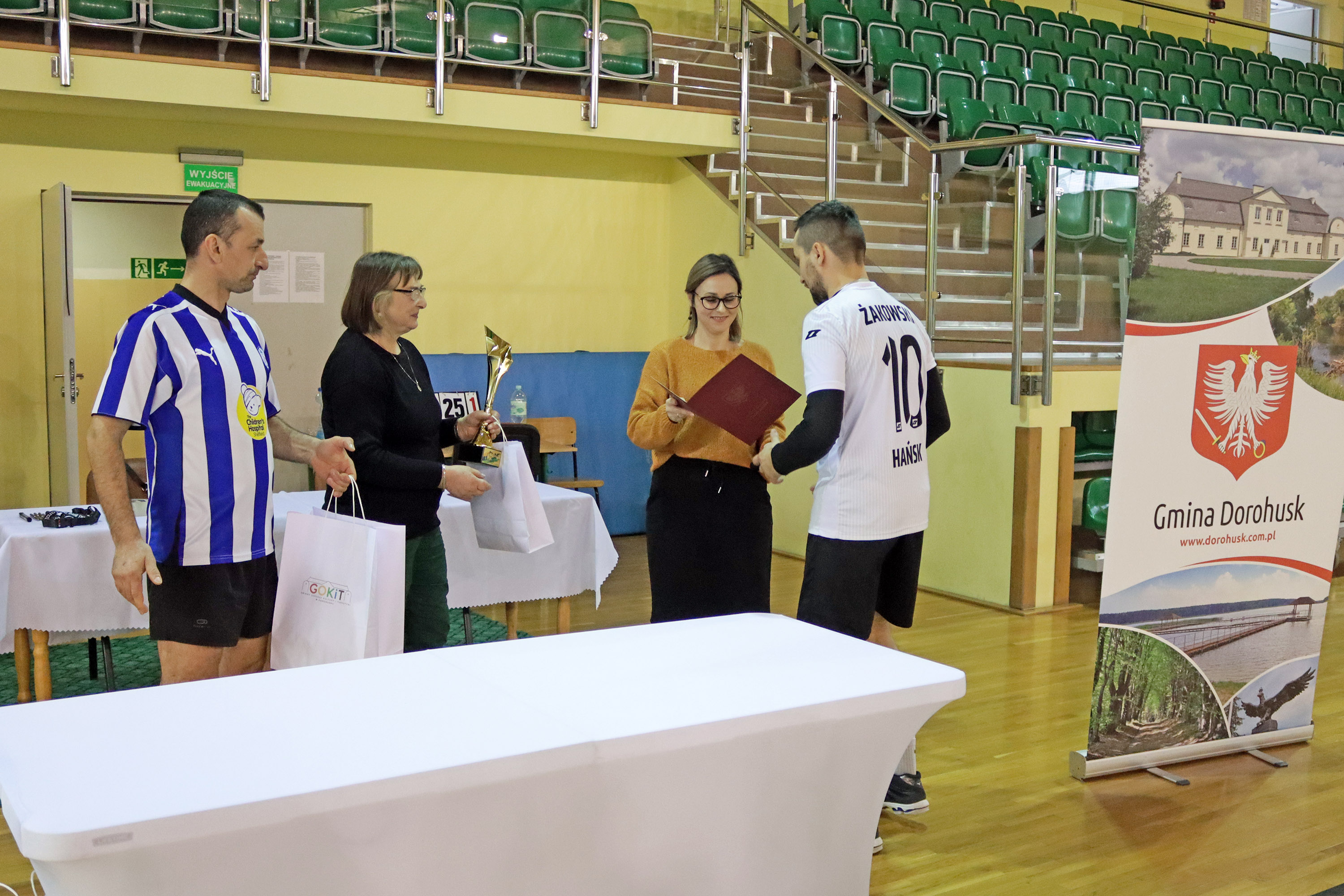 Puchary i nagrody rzeczowe, w imieniu Wójta Gminy Dorohusk – Wojciecha Sawy, wręczali: Przewodnicząca Rady Gminy Dorohusk – Małgorzata Sarzyńska, Dyrektor GOKiT w Dorohusku – Renata Lalik oraz Marek Heniborg z Libero Dorohusk.